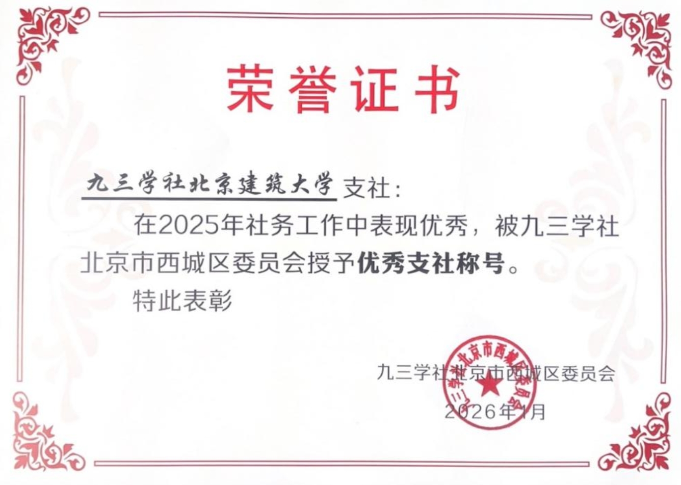 荣誉是鼓励,更是鞭策。此次获奖,既是对我支社既往工作的褒奖,也是对今后工作的期许。九三学社北建大支社全体社员将以此为契机,珍惜荣誉,再接再厉,不断加强自身建设,提升履职能力,力争在思想政治引领上展现新面貌,在参政议政上实现新作为,在社会服务上作出新贡献,为助推首都高质量发展、助力学校高水平特色大学建设汇聚九三智慧、贡献九三力量!
