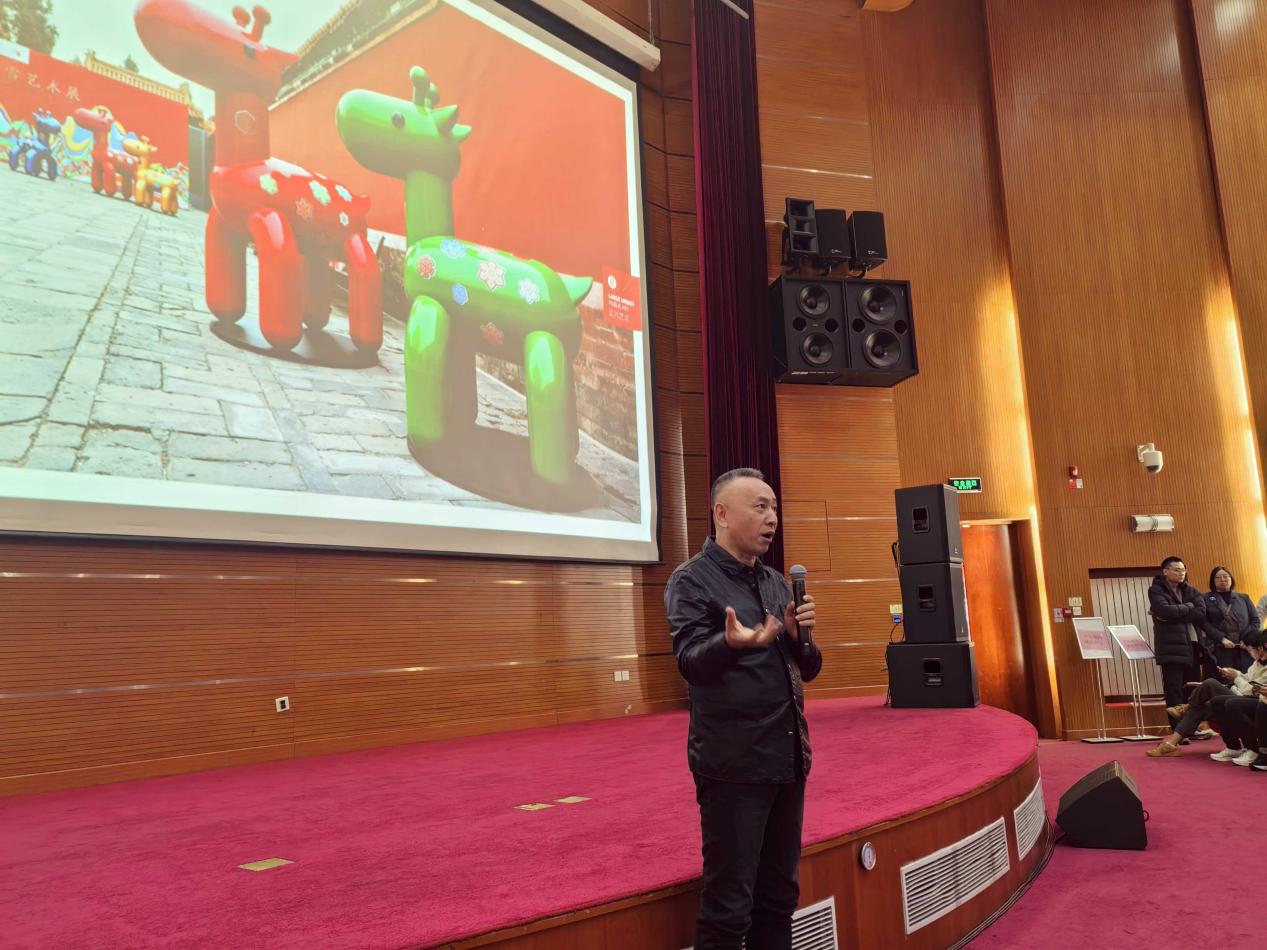 刘恒甫围绕“城市公共艺术赋能城市建设”,从文明演进、创作理念与实践案例等方面,阐释了城市公共艺术在新时代的使命、价值与发展路径。他指出,城市公共艺术作为城市文化的重要载体,兼具公共性与艺术性,其核心标准是“让本地人自豪,外地人向往”。在人类文明从游猎、农耕、工业迈向数字文明的进程中,城市公共艺术不断更新迭代,成为塑造城市精神和提升文化自信的重要力量。公共艺术不仅在美化城市空间,更承担着文化传播、精神引领的责任。他强调,公共艺术的创作需尊重城市物理空间与人文底蕴,坚守原创精神,避免千城一面和低俗化现象。创作者应具备宏观视野,将城市历史、产业发展、公众需求等要素融入作品,使公共艺术成为“与城市共呼吸”的生命体。他结合冬奥会、“一带一路”、新中国成立70周年庆祝活动等重大项目的实践,展示了如何以东方美学和家国情怀构建公共艺术的时代叙事。讲座最后,刘恒甫回答师生现场提问,与师生深入交流互动,现场气氛热烈。