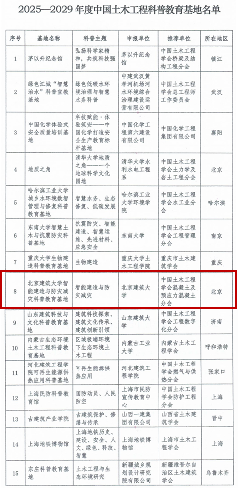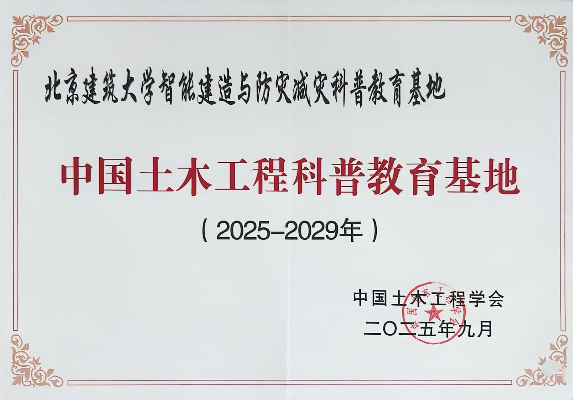 近日,中国土木工程学会公布2025-2029年度中国土木工程科普教育基地名单,我校“智能建造与防灾减灾”科普教育基地获批。此次,全国共有15家单位获批,北京地区仅清华大学和我校获得立项。