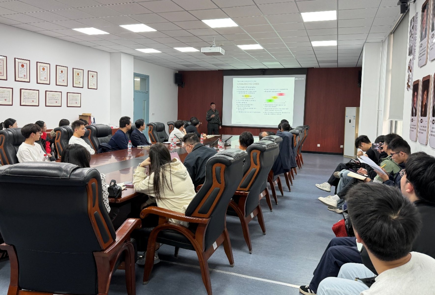 随后Beer教授在土木馆为学院师生作了题为“Epistemic Uncertainties: Challenges, Benefits and Solutions”的专题学术报告,详细介绍其团队在认知不确定性的相关模型的最新研究进展,并重点阐述模型在工程分析和设计中的应用能力及附加价值,通过示例说明了各模型的相应特征;同时还介绍了其团队提出的高效数值求解技术,该技术可用于量化复杂非线性时程工程分析中的认知不确定性及可靠性分析,还可用于敏感性分析、设计优化、模型更新等。本场学术盛会座无虚席,现场研讨氛围浓厚,大家表示领略了国际顶级专家风采,视野大开、收获丰硕。