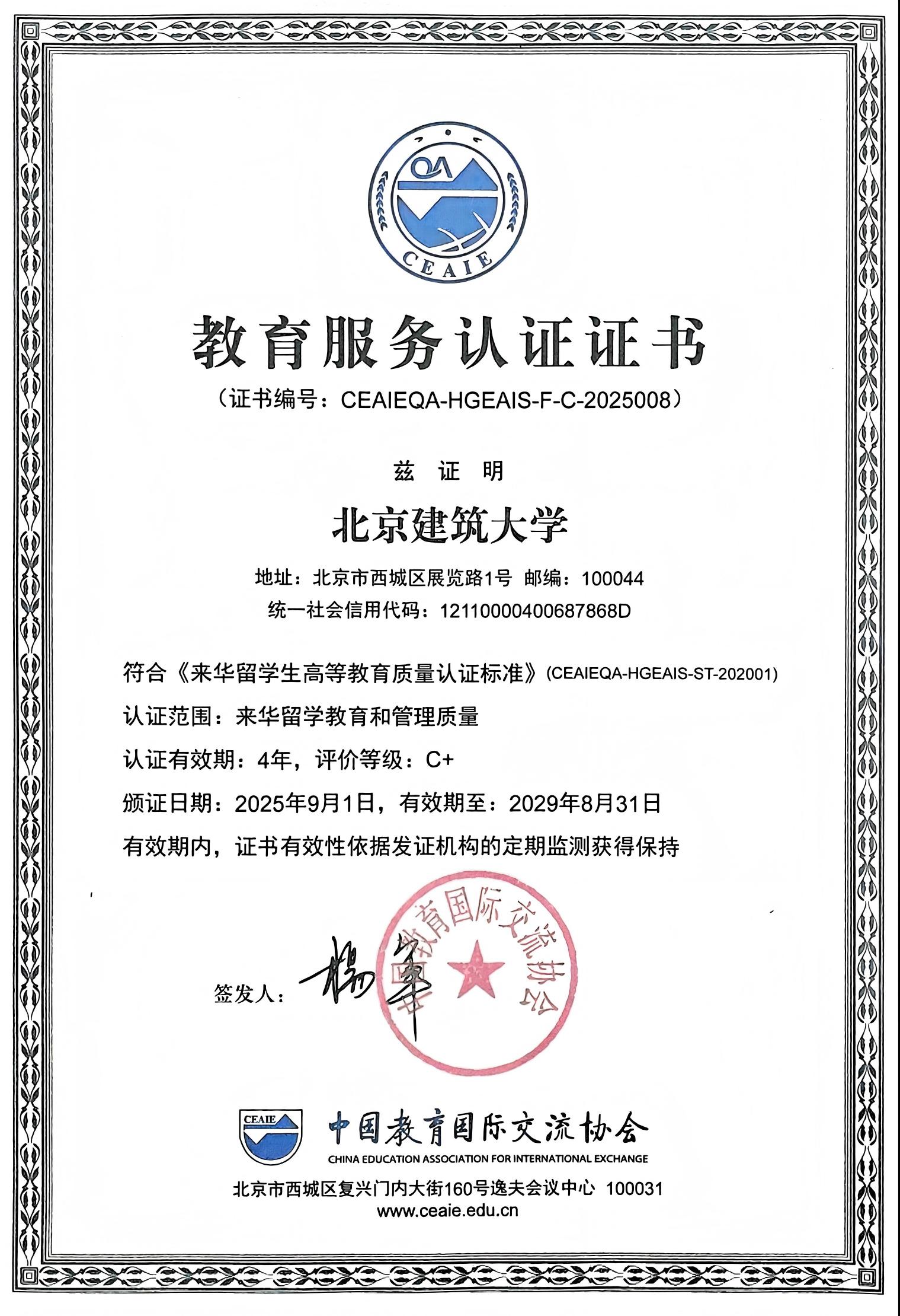 经过严格的审查与评估,认证专家组对我校来华留学生教育工作给予了高度评价,认为我校作为北京市与住房和城乡建设部共建高校和高水平特色型大学,已形成以土木建筑为引领、工科为主、本科-硕士-博士-博士后完整的人才培养体系,这为来华留学教育奠定坚实基础。学校来华留学教育特色鲜明、成效显著,为服务国家战略、推动教育开放和促进“一带一路”共建作出了积极贡献。