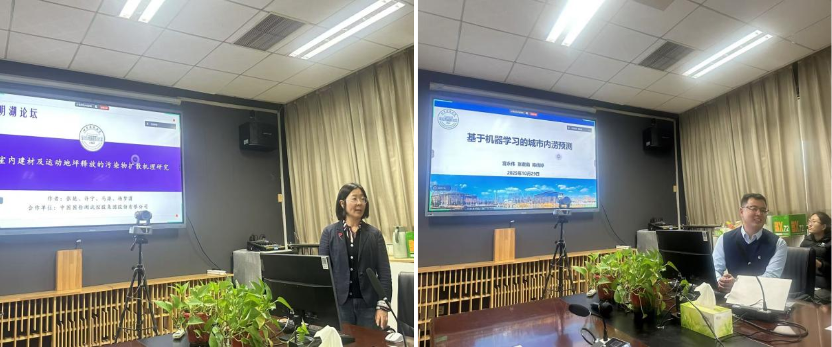 在师生交流环节,与会师生就污染物扩散建模、机器学习预测精度、脉冲系统控制策略、材料设计理论验证等问题展开了深入讨论。