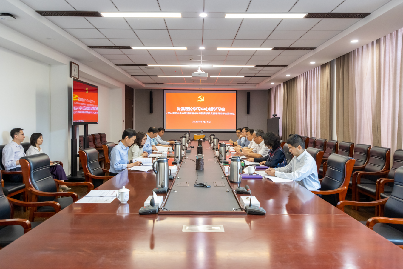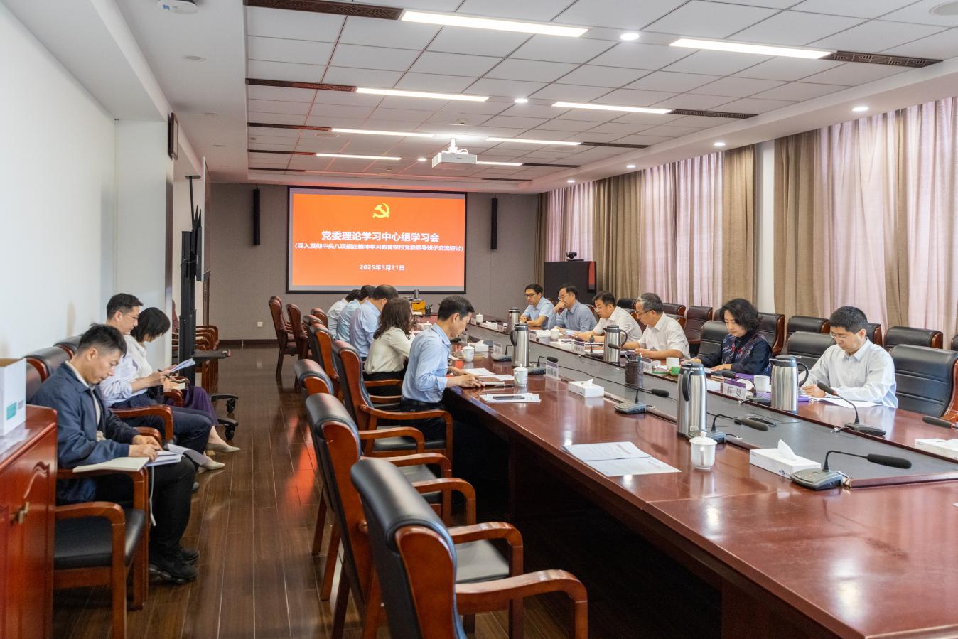 为深入学习贯彻中央八项规定精神,5月21日,学校党委理论学习中心组举行专题学习会,开展深入贯彻中央八项规定精神学习教育学校党委领导班子交流研讨。党委理论学习中心组专题学习习近平总书记关于加强党的作风建设的重要论述和中央八项规定及其实施细则精神,总结学习深入贯彻中央八项规定精神的成效和经验,并进行交流发言和深入研讨。