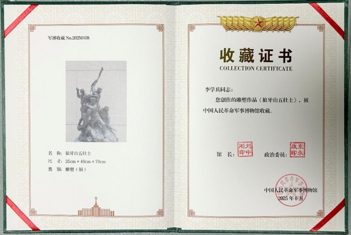 近日,我校盟员李学兵副教授收到中国人民革命军事博物馆颁发的收藏证书。其雕塑作品 “狼牙山五壮士” 被该馆收藏。