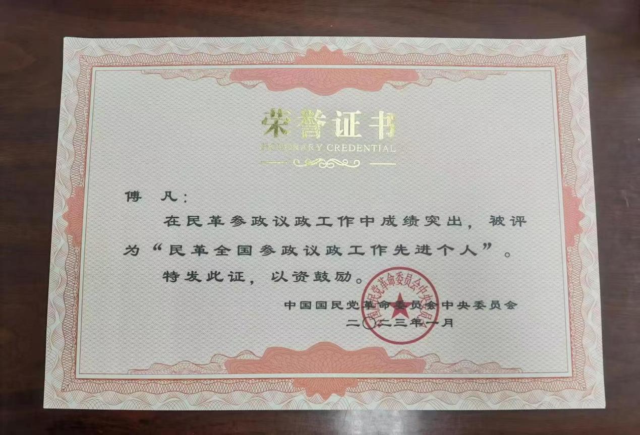 一分耕耘,一分收获。2023年,民革中央对5年来在参政议政工作中做出突出贡献的先进集体和先进个人进行表彰,傅凡被授予“民革全国参政议政工作先进个人”称号。此外,他还获得石景山区年度优秀调研报告奖、石景山区政协委员履职先进个人、石景山区政协年度优秀社情民意等荣誉。