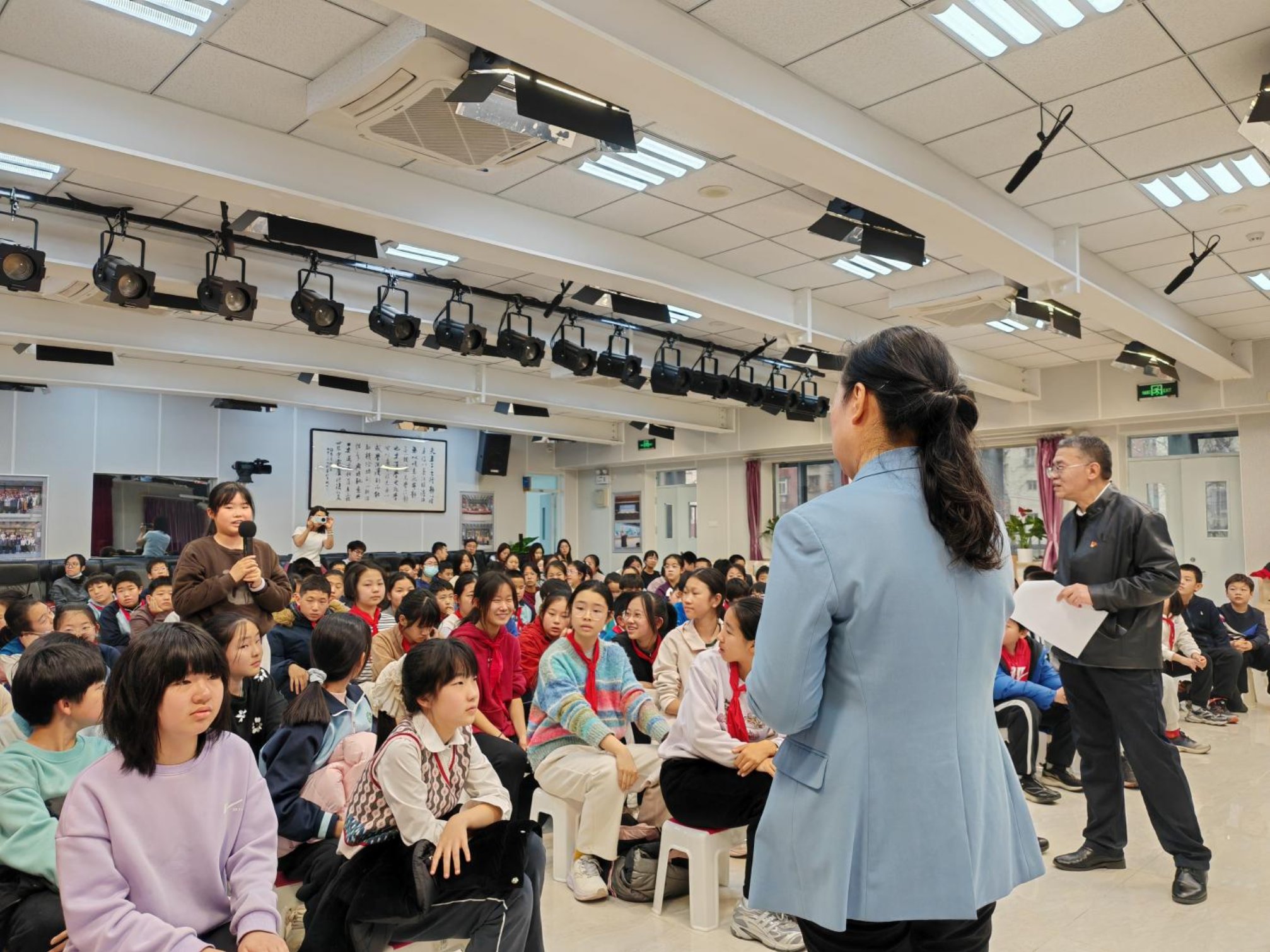 在互动环节,“如果我们的‘学生建议’想让相关部门看到,有什么途径?”“您在推动问题解决时遇到过什么困难?”附属小学的“小代表”们带着思考踊跃提问。秦红岭耐心解答并鼓励同学们:“民主不是等长大了才开始,而是从关心社会的那一刻开始。同学们可以通过写信、参与社区讨论等合法渠道表达想法。这正是‘红墙意识’在日常生活中的真实体现。”