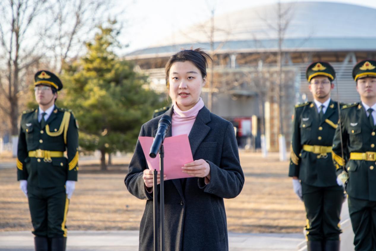 校国旗护卫队队长、测绘学院遥感231班龙司雨同学作为学生代表发言,她分享了护卫国旗的初心与坚守,表达了新时代建大青年的责任与担当,表示将以校训为帆,练就过硬本领,以青春之我在中国式现代化征程中挺膺担当。