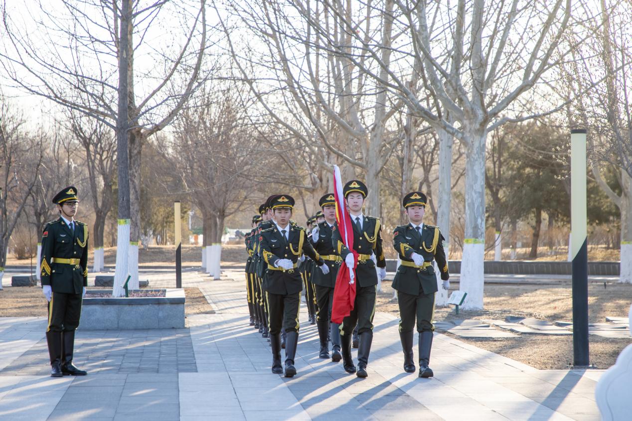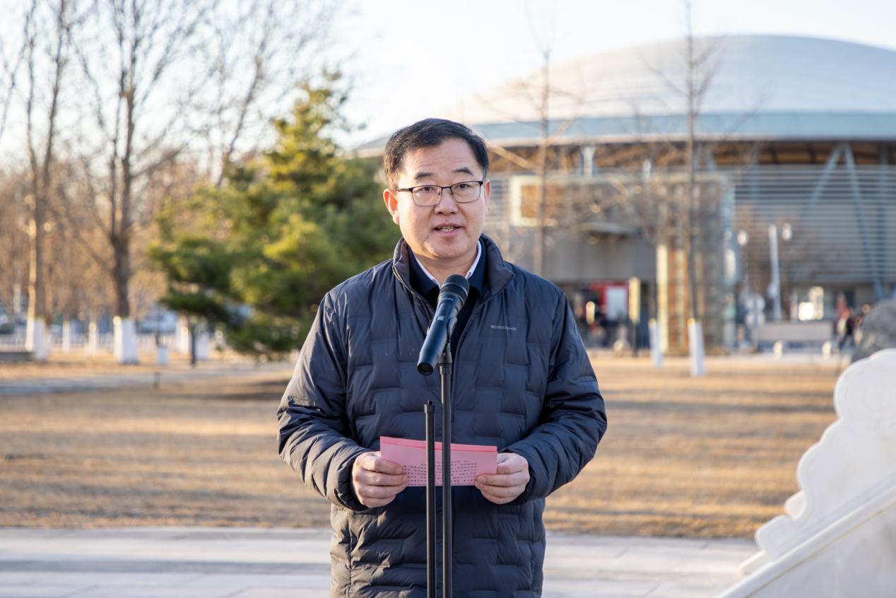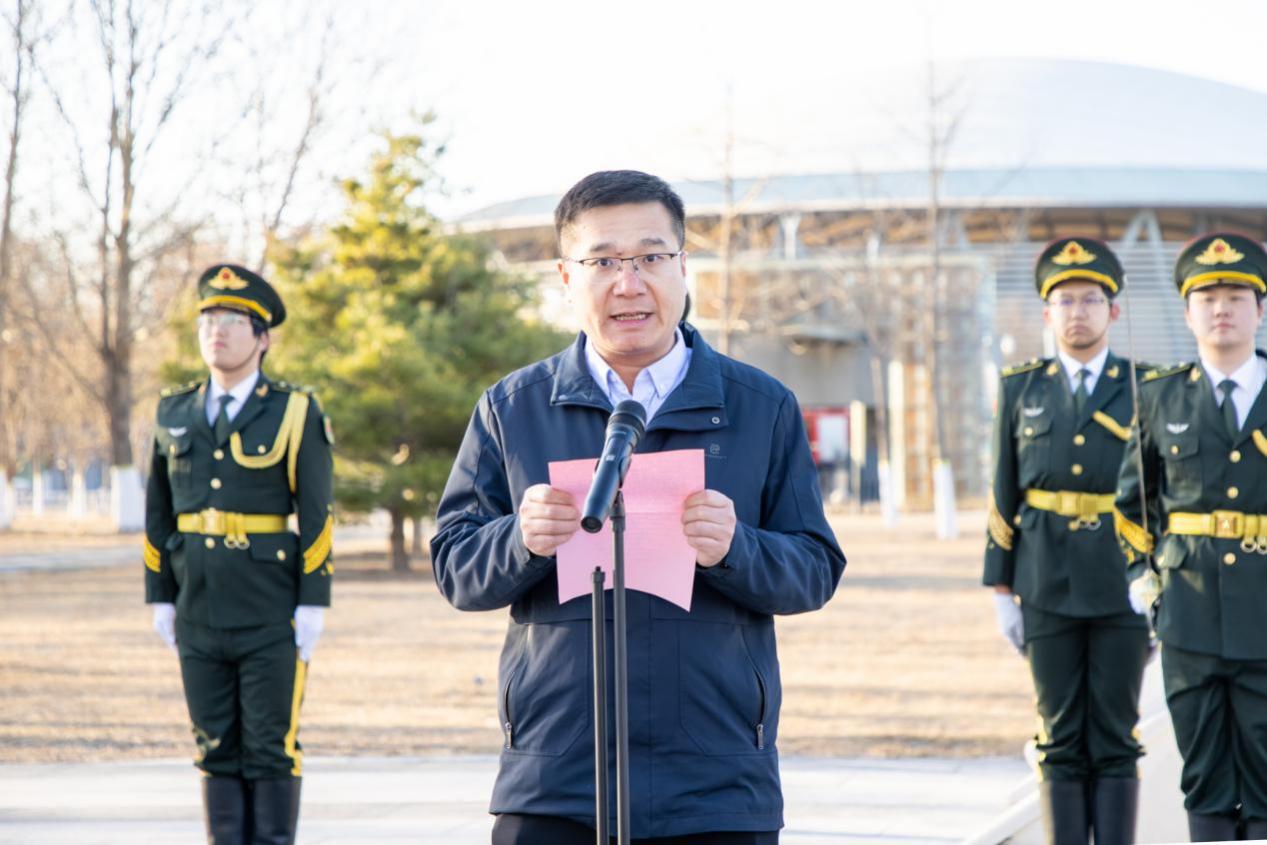 仪式上,王爱军详细介绍了这根纪念旗杆的特殊意义与深刻内涵。该旗杆是2025年9月3日中国人民抗日战争暨世界反法西斯战争胜利80周年纪念大会之际,在天安门广场矗立的80座纪念旗杆之一,由北京市委教育工委郑重转赠我校,是见证民族荣光的珍贵精神载体。旗杆总高14米,寓意着中华民族从1931年“九一八”事变到1945年抗战胜利的14年艰苦卓绝抗争历程。旗墩重达6吨,稳如磐石的体量象征着中华儿女众志成城、坚不可摧的民族意志,表面精心雕刻的“长城纹”,既延续了中国传统建筑的文化基因,又以长城“众志成城、抵御外侮”的精神内核,象征着抗战时期各族人民同心同德、共赴国难的磅礴力量,纹路错落间,尽显历史厚重与精神传承。
