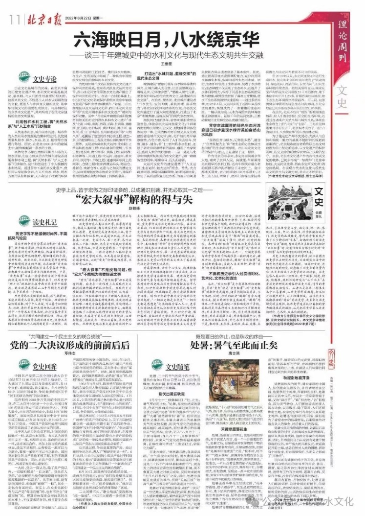 2022.08.22王崇臣教授撰写的《六海映日月,八水绕京华》在北京日报·理论周刊发表。