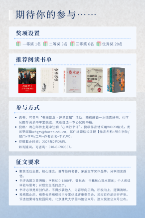 我校读书征文活动是学校积极建设书香校园、推进“文化育人”教育目标的重要举措,迄今已持续举办了十九届。本届征文活动是图书馆联合学校党委宣传部(融媒体中心)、学工部、教务处、校工会、校团委、北京畅想之星信息技术有限公司等多家校内外单位、部门举办的大型读书活动,以“以心阅书,以行致远”为主题,倡导师生在数字时代背景下,以专注的阅读观和“行以致远”的实践观,知行合一,学以致用,努力实现个人成长与社会价值。本届征文活动将持续到2026年2月底。